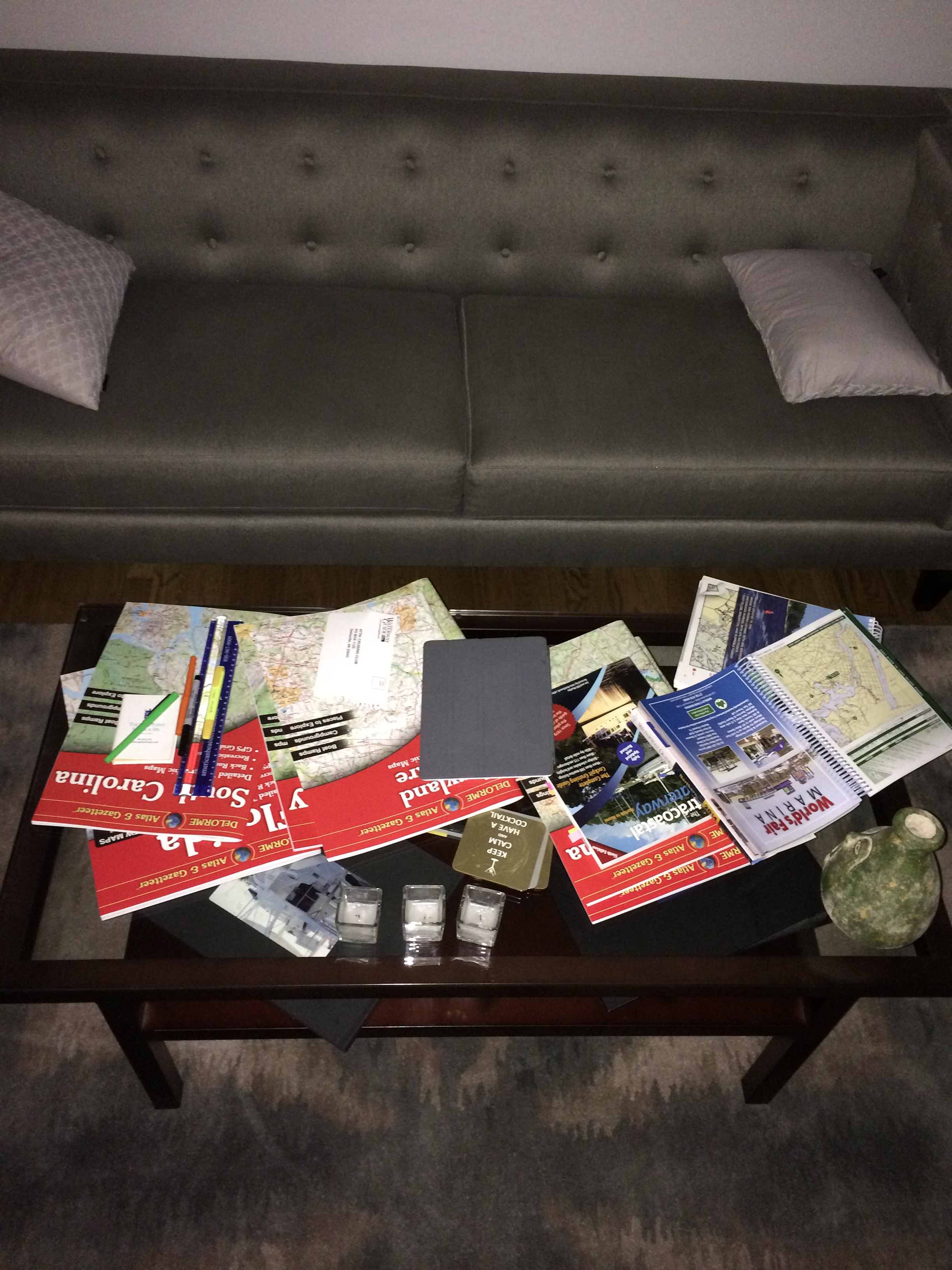 So for the past week, every night, we’ve been having a Map Party (Amy’s name), where we highlight our planned route in green. Page after page of charts – a thin green line snaking slowly north. A line that’s mirrored by an orange line that works its way up the corresponding state’s DeLorme Atlas and Gazetter (thanks Matt for that suggestion) The route on the atlas is an excellent “big picture” view of where we are.