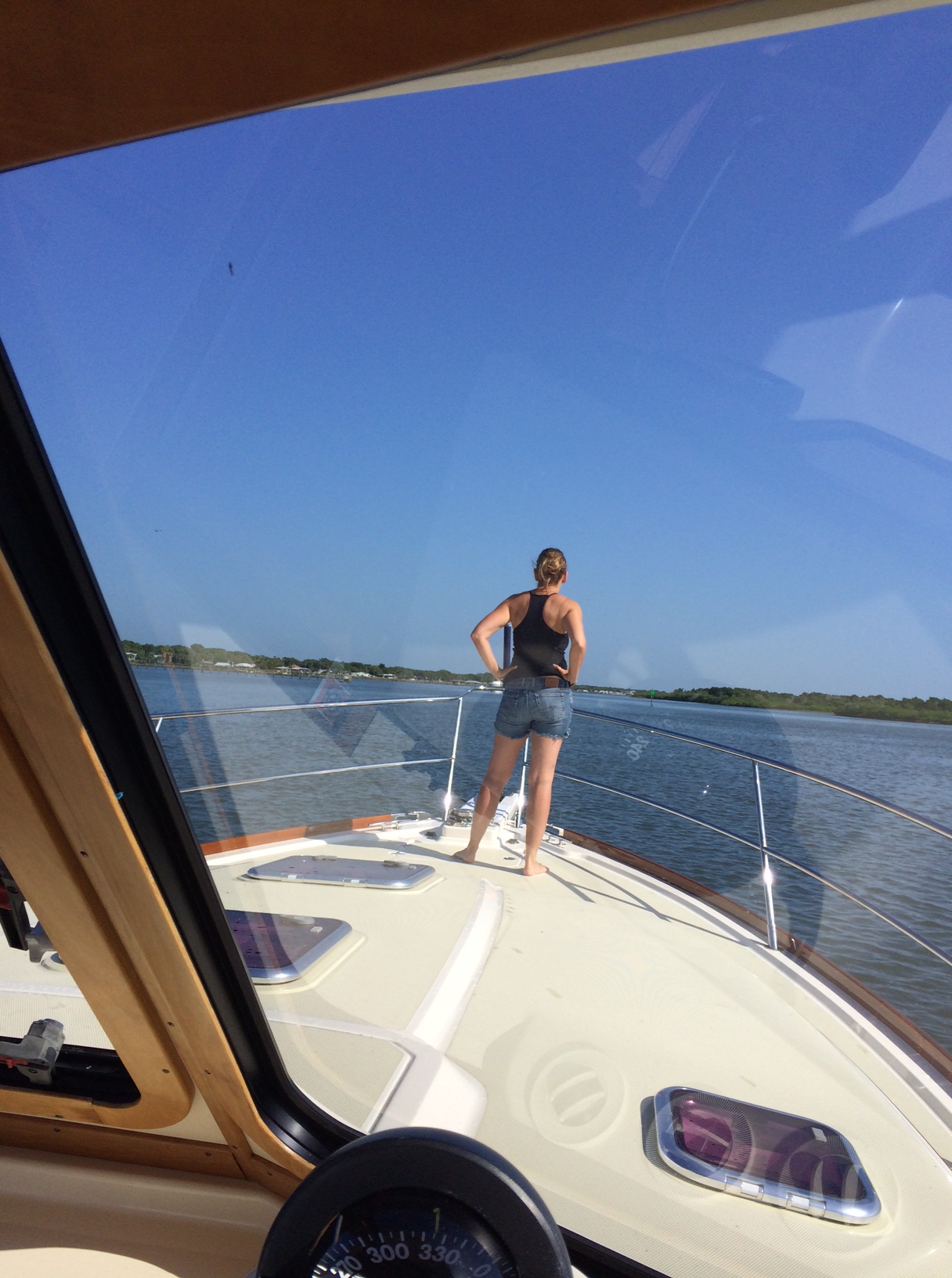 But to back up – this morning, during our third trip to West Marine (and yes, the crazy ACE Hardware as well), we met up with our broker, Peter, who had flown down from Portland, ME to go over the boat with us. And so we did, stem to stern, helm to holy space and everything in between. Then it was time to take her out for the first time! We pulled out of her slip, me at the helm, Peter and Amy tending lines, the usual dock walkers watching our departure, and…